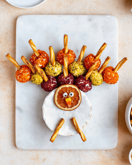 In this recipe, the cheese balls are just part of the Turkey-shaped cheese sculpture! They are essential to the construction, but I also used three different coatings to diversify the colors and flavors; pistachios, dried cranberries, and dried apricots are delicious additions to any cheese board (I often add them as accoutrements!), especially during the fall and winter.