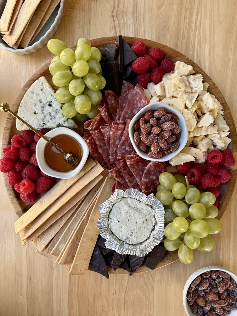 Whenever I’m trying to keep costs down, the first thing I do is look for whole cheese blocks or logs. Buying pre-cut will add to the price. If I’m still struggling to stay below budget, I will double-up on some of the more affordable items, like grapes, to help me fill the board to make it look plentiful at a lower cost.