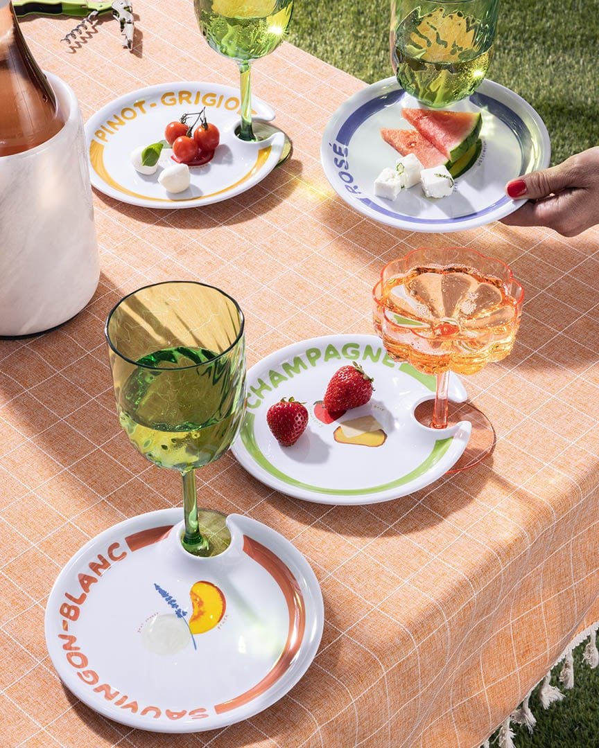 These appetizer plates not only hold your wine for handy sipping & snacking, but they also show you the best wine & cheese pairings.