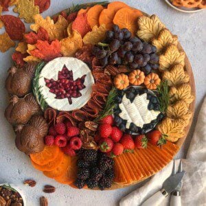 A sweet and savory Thanksgiving platter is a perfect add to a Friendsgiving potluck or your family’s Turkey Day table. The best thing is that, while I love to serve this as a Thanksgiving appetizer, you can enjoy it all-fall-long–I especially love the Brie cut-out leaf!